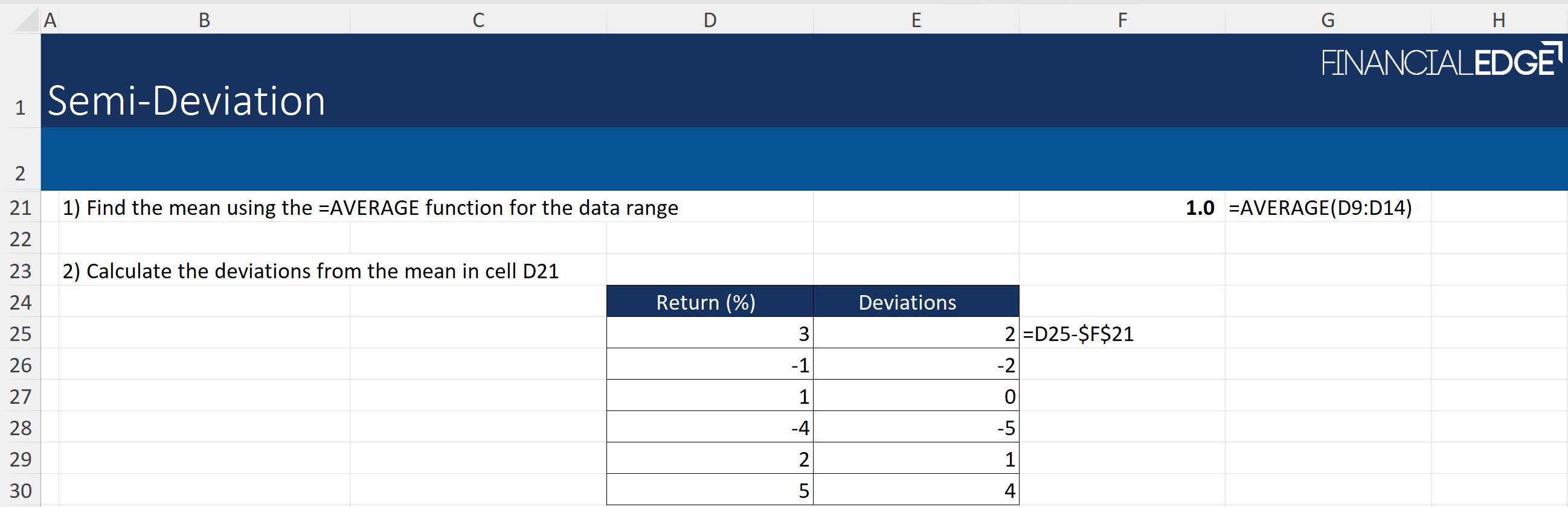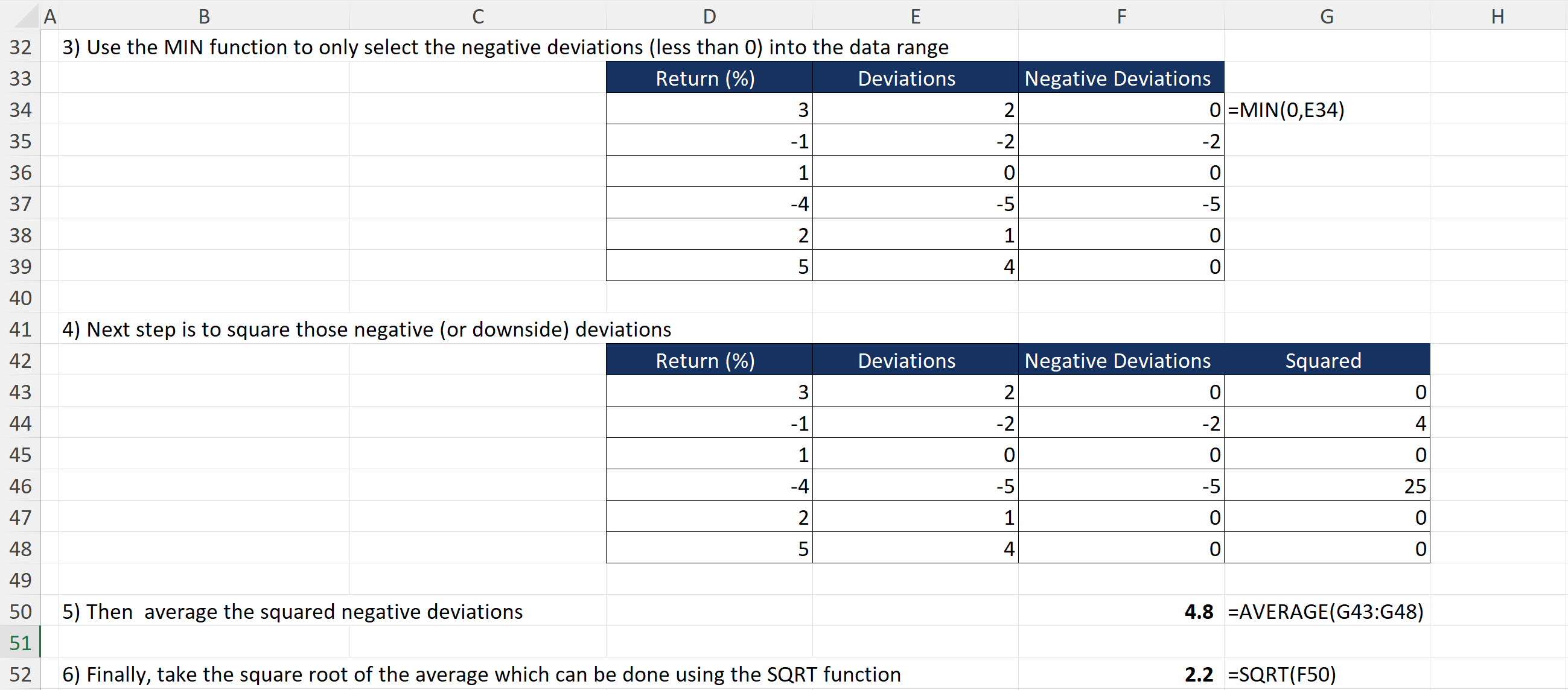 Unlike standard deviation, semi-deviation is not built into Excel and requires a few steps to calculate, as outlined below: