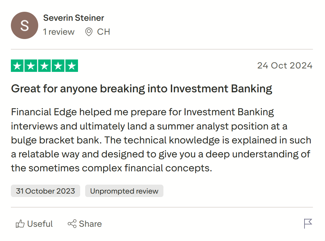 “Financial Edge helped me prepare for Investment Banking interviews and ultimately land a summer analyst position at a bulge bracket bank. The technical knowledge is explained in such a relatable way and designed to give you a deep understanding of the sometimes complex financial concepts.”