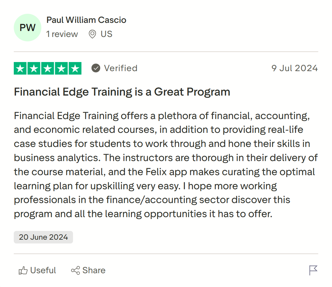 “Financial Edge Training offers a plethora of financial, accounting, and economic related courses, in addition to providing real-life case studies for students to work through and hone their skills in business analytics. The instructors are thorough in their delivery of the course material, and the Felix app makes curating the optimal learning plan for upskilling very easy. I hope more working professionals in the finance/accounting sector discover this program and all the learning opportunities it has to offer.”