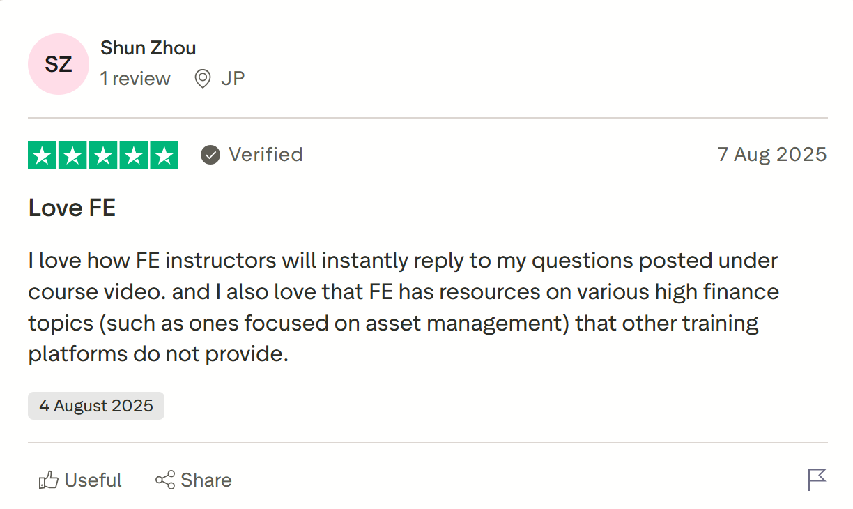 “I love how FE instructors will instantly reply to my questions posted under course video. and I also love that FE has resources on various high finance topics (such as ones focused on asset management) that other training platforms do not provide.”