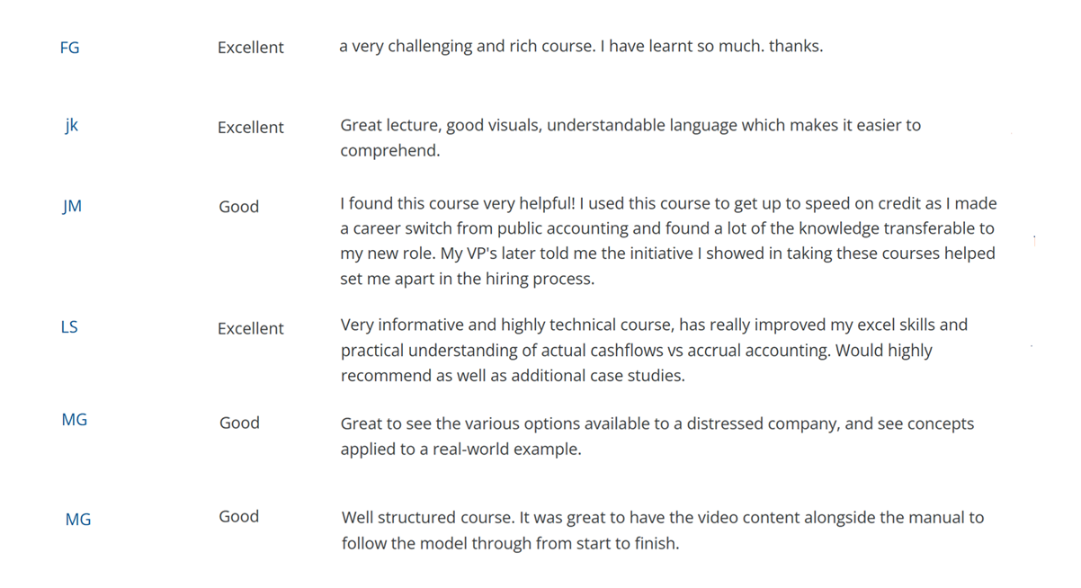 Students who have completed the Credit Analyst course found it “challenging and rich”, “well structured”, and “very informative and highly technical”. They have said it was great to “see concepts applied to a real-world example”. They have also said it was helpful to “get up to speed on credit” and taking the course showed initiative and “helped set [them] apart in the hiring process”.