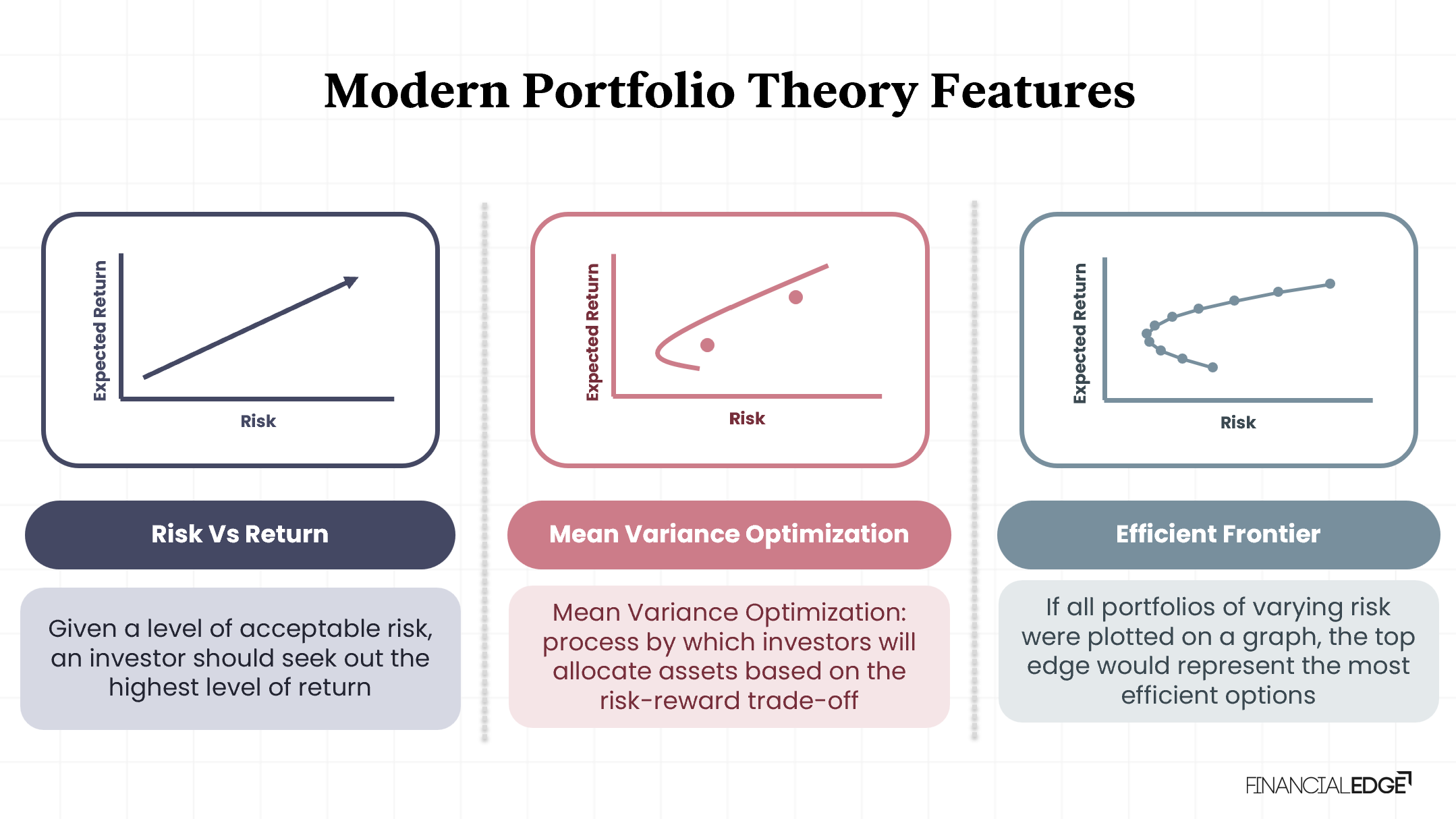 - Risk vs. Return forms a key feature of the theory. Investors should seek the highest return for an acceptable level of risk.