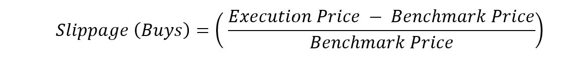 Slippage (Buys) = ((Execution Price – Benchmark Price) / (Benchmark Price))