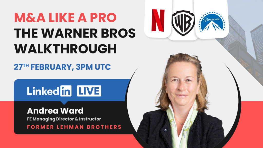 Join Andrea’s free 30-minute M&A analysis session, on the 27th February on LinkedIn, where we’ll walk through how investment bankers assess the financial implications of an M&A transition, using the ongoing Warner Bros., Netflix, and Paramount situation as a live case study.